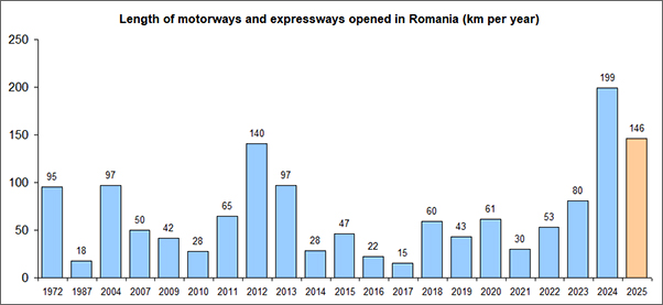 The year 2025 was the second-best year for high-speed road openings in Romania. This year, 146 kilometers of motorways and expressways were opened, after nearly 200 km were opened last year. These are good figures, and we hope this pace will be maintained in the future. The total length of motorway and expressway segments opened annually in Romania is presented below: