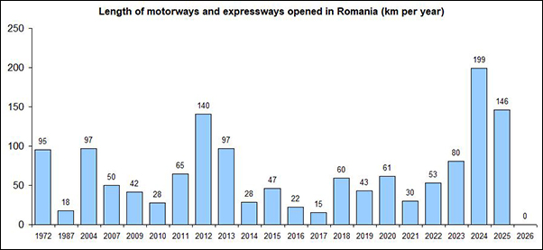 There were no new motorway or expressway sections opened in Romania in Q1 2026. The total length of motorway and expressway segments opened annually in Romania is shown below: