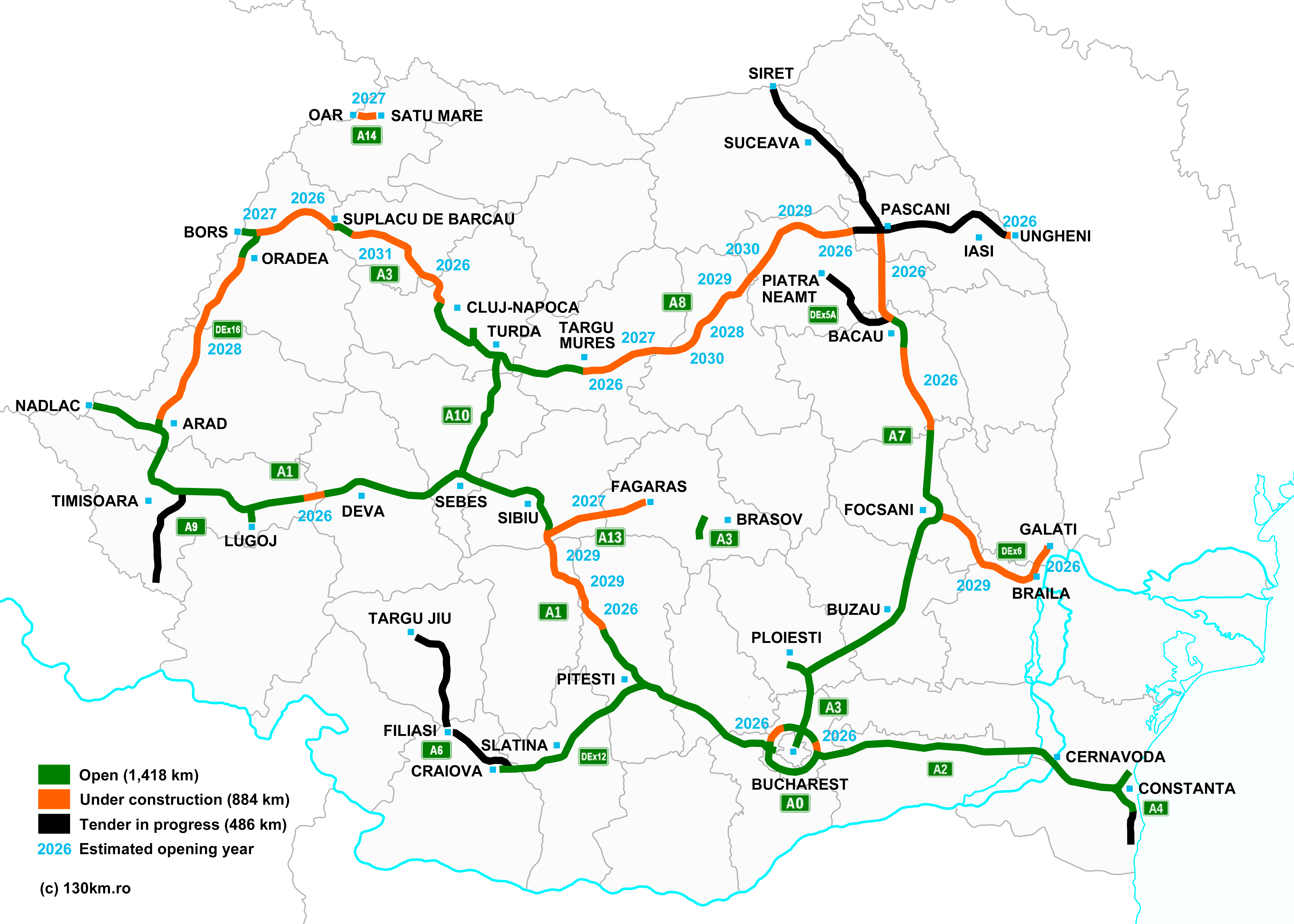 At the end of March 2026, Romania had a motorway and expressway network with a total length of 1,418km. In addition to these, there were a total of 884km under construction and 486km in the tendering phase.